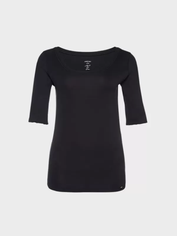 A simple style in the finest quality: that is this clean-cut shirt with half sleeves and a wide, round-neck cutout. The soft cotton with added spandex and the sophisticated manufacturing techniques meet the most demanding expectations. The appliquéd gemstone at the front above the hemline adds an extra classy touch.