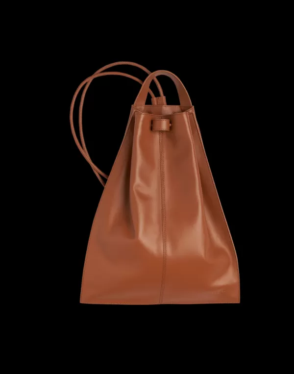 Two-tone drawstring backpack in alternate panels of smooth ivory and black hide. Constructed like a large rectangular envelope bag with a self-leather tubular drawstring running through eyelets across the top edge that extend into shoulder straps connecting the bag to the bottom edge. There is also a hand-carrying loop attached to the top edge and a small loop at the centre front pulls out to gather-in the top edge when the piece is being worn.
