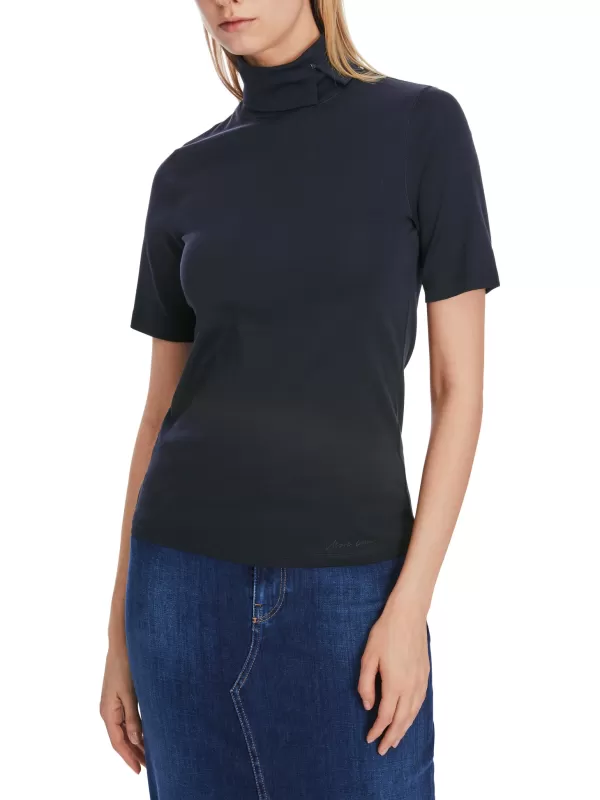 Featuring a turtleneck and shiny decorative button, this T-shirt stands out with its sporty elegance. It has a close-fitting fit. The soft stretch cotton fabric is comfortable to wear. Half-length sleeves round off the design.