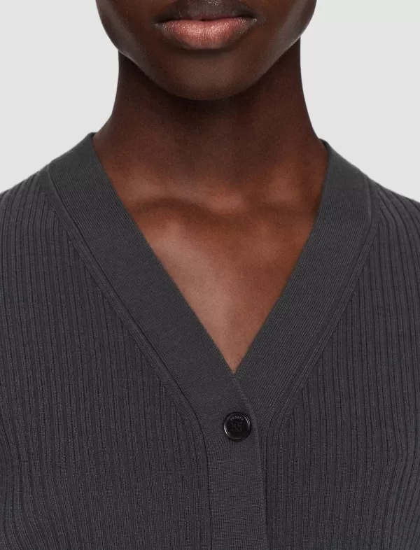 The Merino Rib Cardigan is a slim fit, short cardigan, crafted from a fine Italian merino wool which has a smooth, compact hand feel. This cardigan is finished in ribbed stitching which gives the piece lightness and stretch.